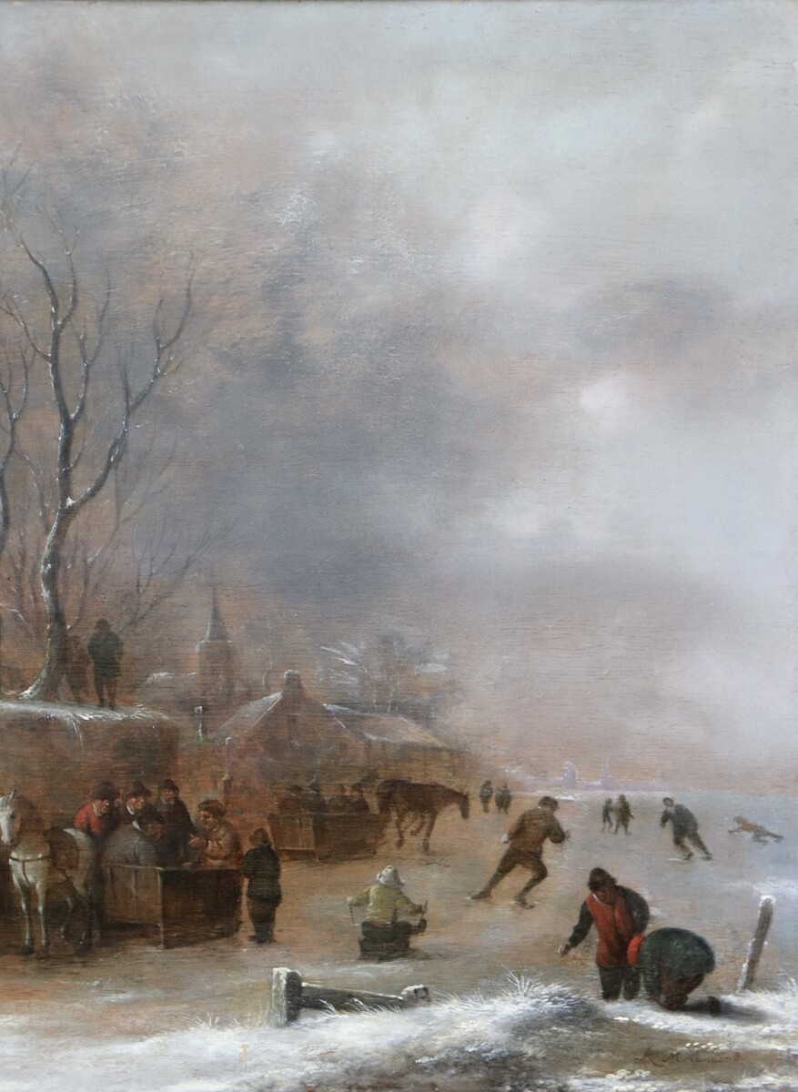 Fifty five percent of Holland lays under the level of the sea. The country was/is constantly fighting to evacuate water from the land: there are numerous rivers and canals. Frozen water ways offered people the chance to have a good time on the ice: a mix of people from all social layers would go for a stroll on the ice, others would go ice skating, go for a ride in a sledge, play kolf (the popular forerunner of ice hockey).