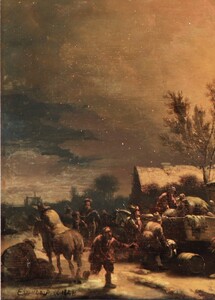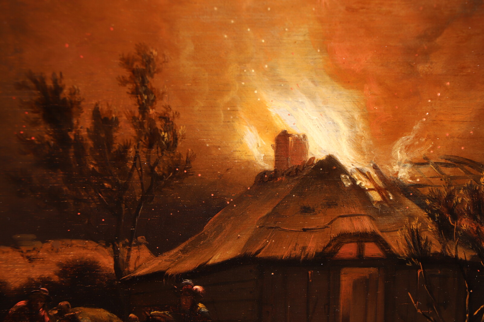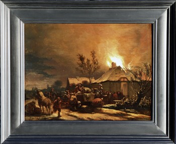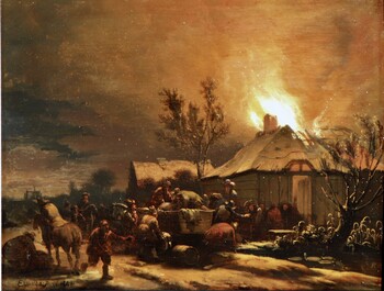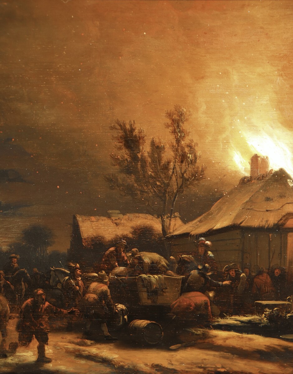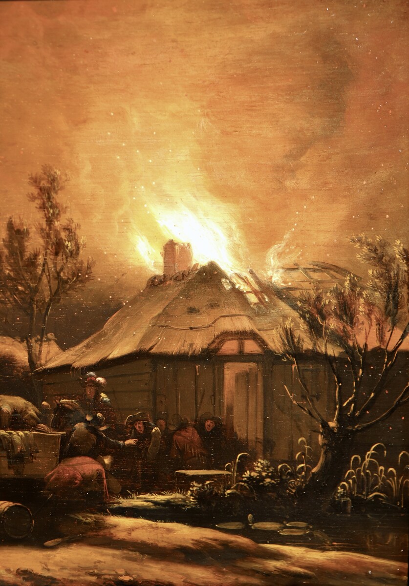 Egbert van der Poel specialised in a highly specific sub-genre of landscape painting: city and village fires at night. Any blazing fire provided a dazzling spectacle, but the contrast between the blackness of the night and a luminous sea of flames gave scenes of this kind an added fascination. Time is needed to accustom one’s eyes to the darkness of the painting, after which numerous previously invisible details appear to come into view. And so it is in this painting, dating from 1658. The viewer’s eye is initially drawn to the flames shooting from the thatched roof of a farmhouse. The blaze is scattering countless burning embers ¬¬– small dots of red and yellow, finishing touches that Van der Poel added with the tip of his brush. The fire does not appear to be spreading very fast: part of the roof is still intact, and those inside are able to save themselves and some of their possessions, with the help of bystanders. Property is being piled high on a horse-drawn cart. But the hectic atmosphere generated by a fire is also palpable, especially in the man seen on the left, on the path: the despair is clearly visible in his features.