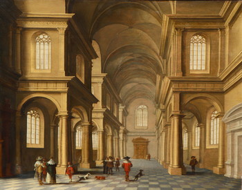 A church interior with visitors
