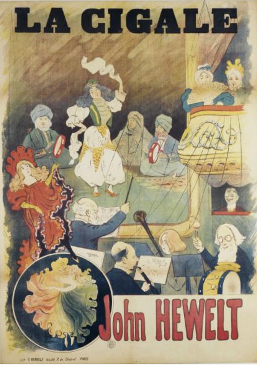 Publicity poster forJohn Hewelt’s marionettes at La Cigale near the Place Pigalle in Paris