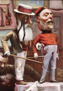 Hewelt’s own productions, for example at the Theatre of the Musée Grévin, included marionettes based on famous performers of the day and included a full puppet orchestra and puppet spectators in theatre boxes. Other productions were political satires (see the puppets in our painting)