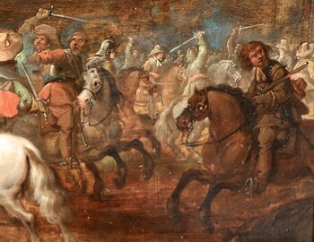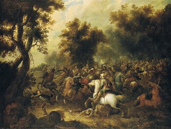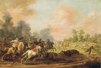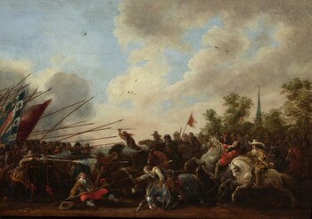Both Flemish and Dutch battle scene specialists favoured depictions with no references to time or place; specific battle scene paintings are very rare. Their clients who fought these cavalry battles belonged to the nobility and to the higher middle class. They made out a quarter of the army.