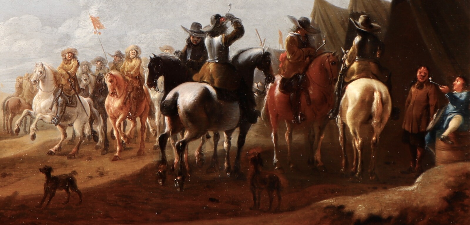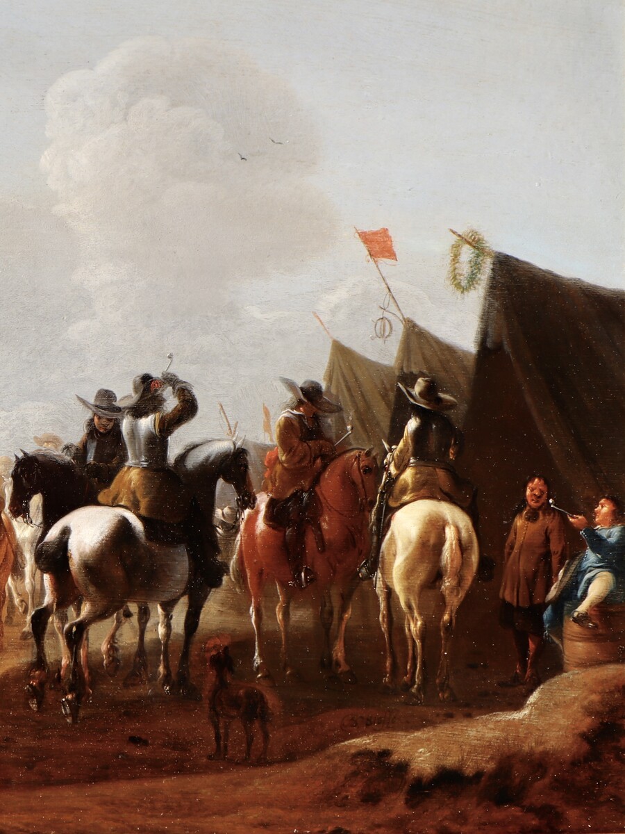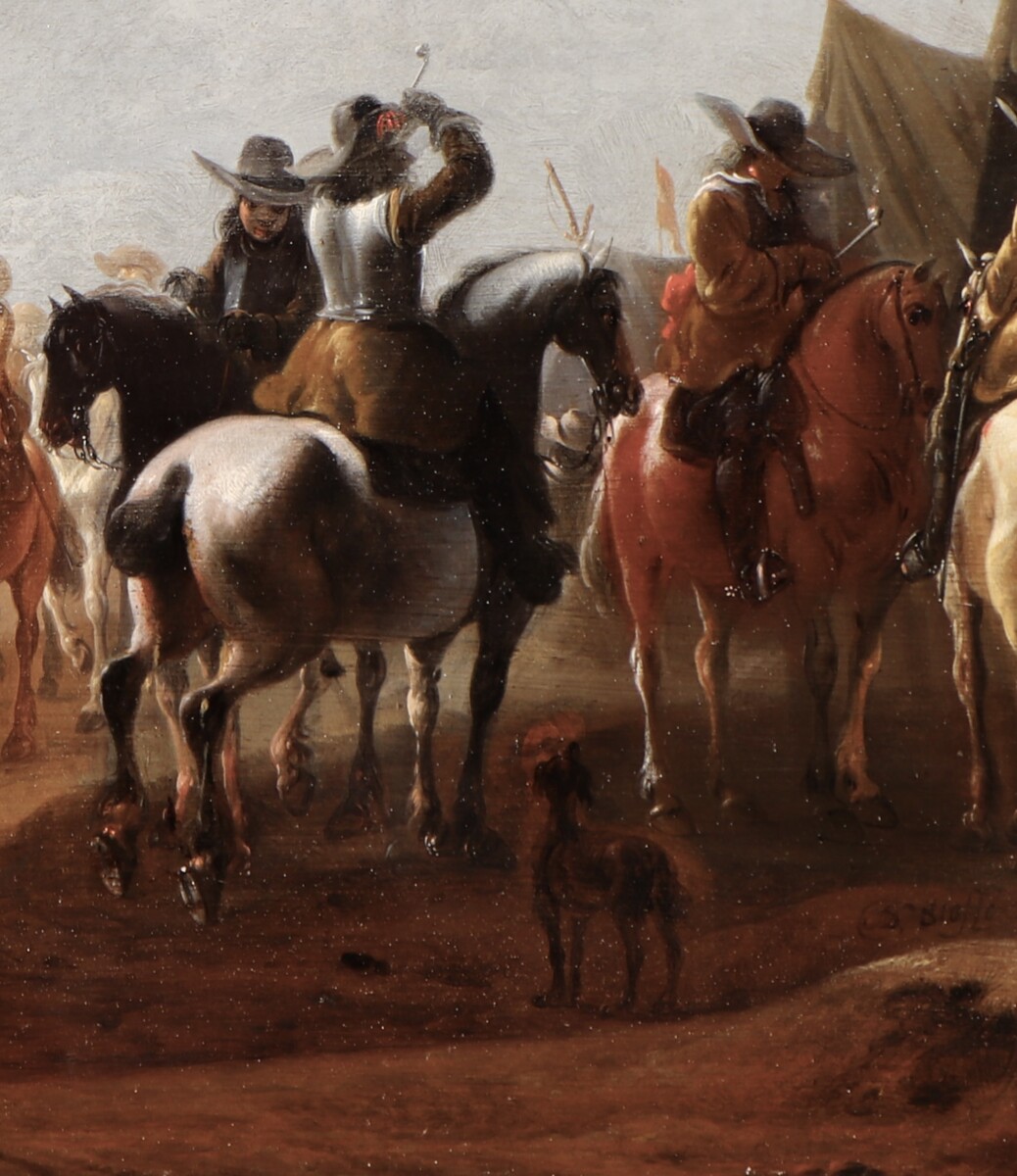 This must be an early painting by van der Stoffe. He did not often paint military encampments, as he specialised in cavalry battle scenes. These camp representations must date from before the Peace of Westphalia, which ended the Dutch war of independence (The Eighty Years’ War) in 1648. The low horizon line is also typical of the late 1630s and 1640s.