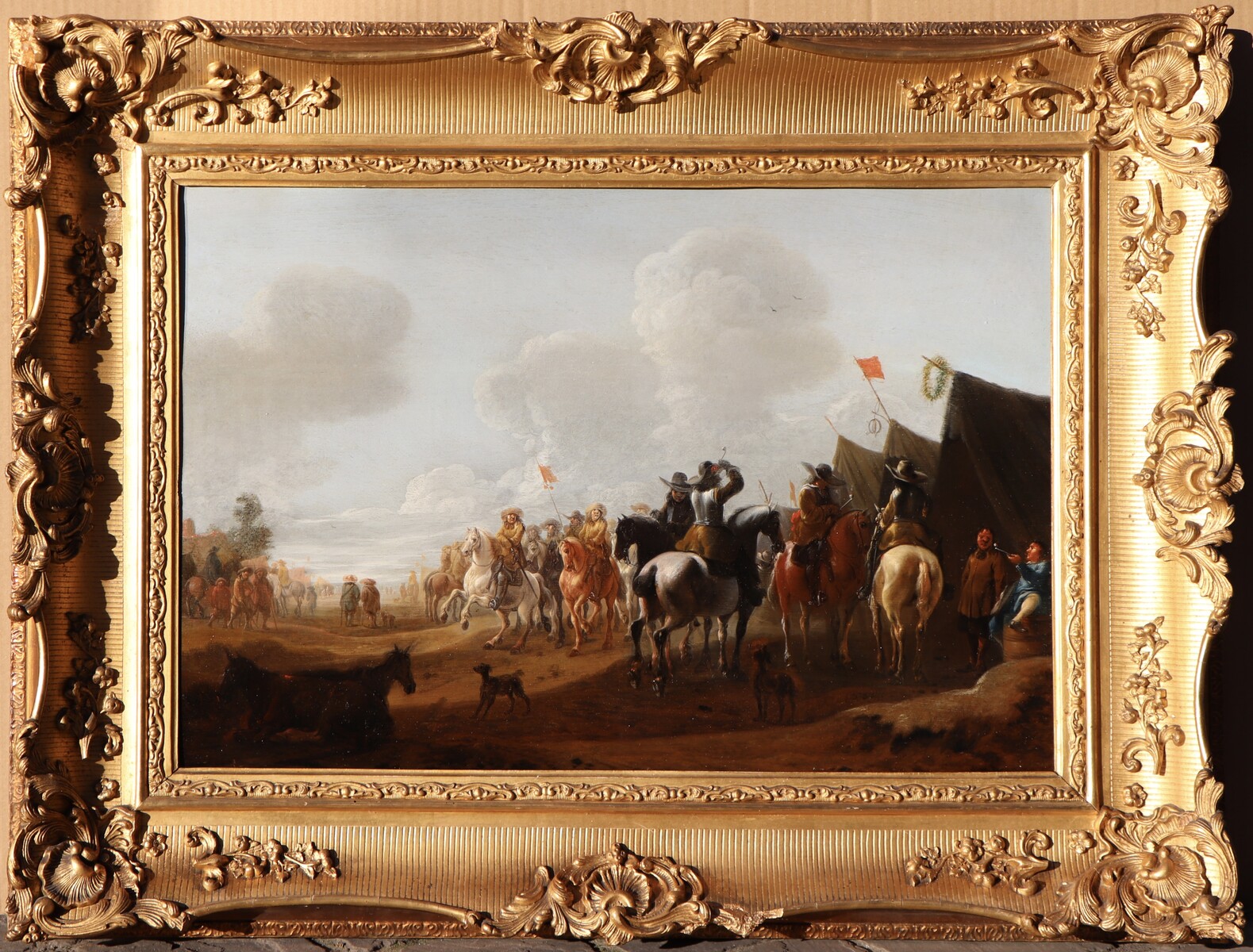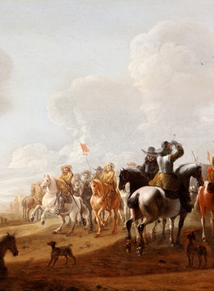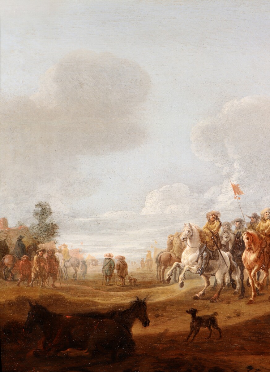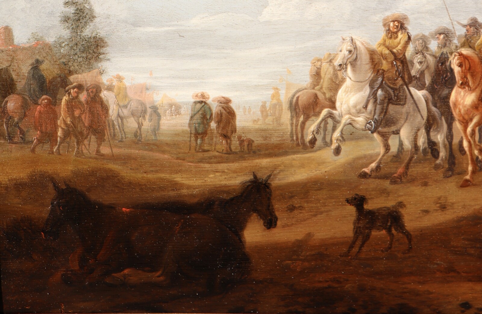 This must be an early painting by van der Stoffe. He did not often paint military encampments, as he specialised in cavalry battle scenes. These camp representations must date from before the Peace of Westphalia, which ended the Dutch war of independence (The Eighty Years’ War) in 1648. The low horizon line is also typical of the late 1630s and 1640s.