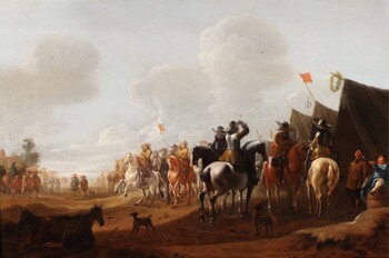 The earliest Dutch paintings representing military encampments date from after the truce that ended in 1621. They were painted by Esaias van de Velde (the earliest one in 1622) and by Palamedes Palamedesz.. Until well after the Peace of Westphalia in 1648 these camps remained a popular subject. The realistic looking approach of the earliest representations shifted rapidly towards a sort of colourful, military genre scenes with many picturesque elements, placed against a landscape setting. As Erik Spaans (1998, P. 178) put it: “order and uniformity are vital to an army, but deadly for a painter”.