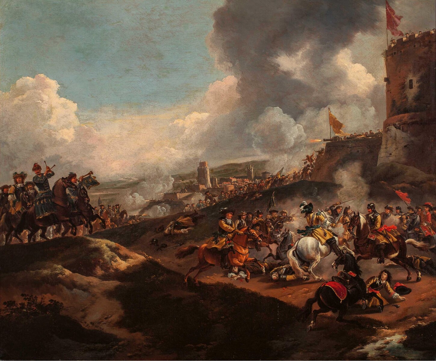"Two cavalry officers surveying the bombardment of a castle"