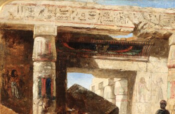 He arrived in Luxor (ancient Thebes) January 1st 1839. The Temple of Medinet Habu stands on its W. bank of the Nile. Based on his sketches drawn in Egypt Müller made his paintings at his return in England: mostly views of the busy town of Cairo, its inhabitants and its slave market. He did not paint that many views of archaeological sites. You may see these in my comparative works. Our painting dates from 1841.