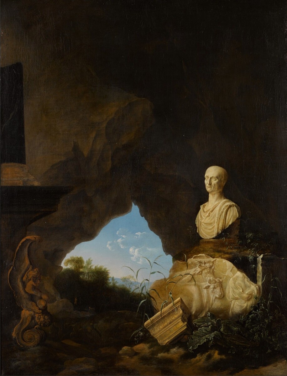 "Ottoman hunters admiring Roman artwork in a cavern"
