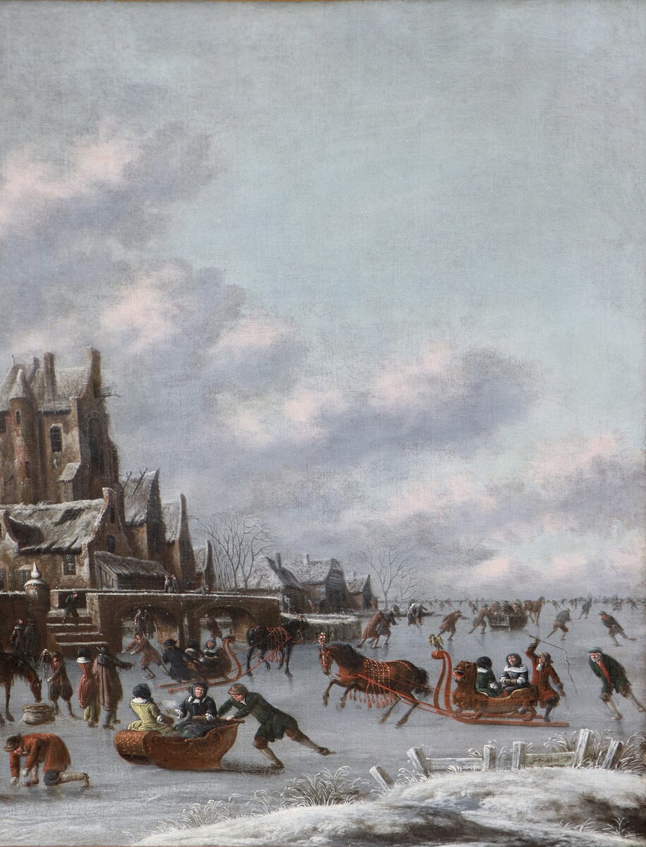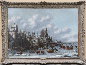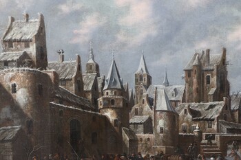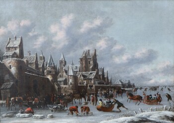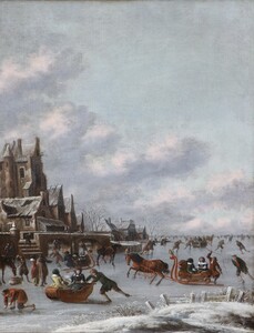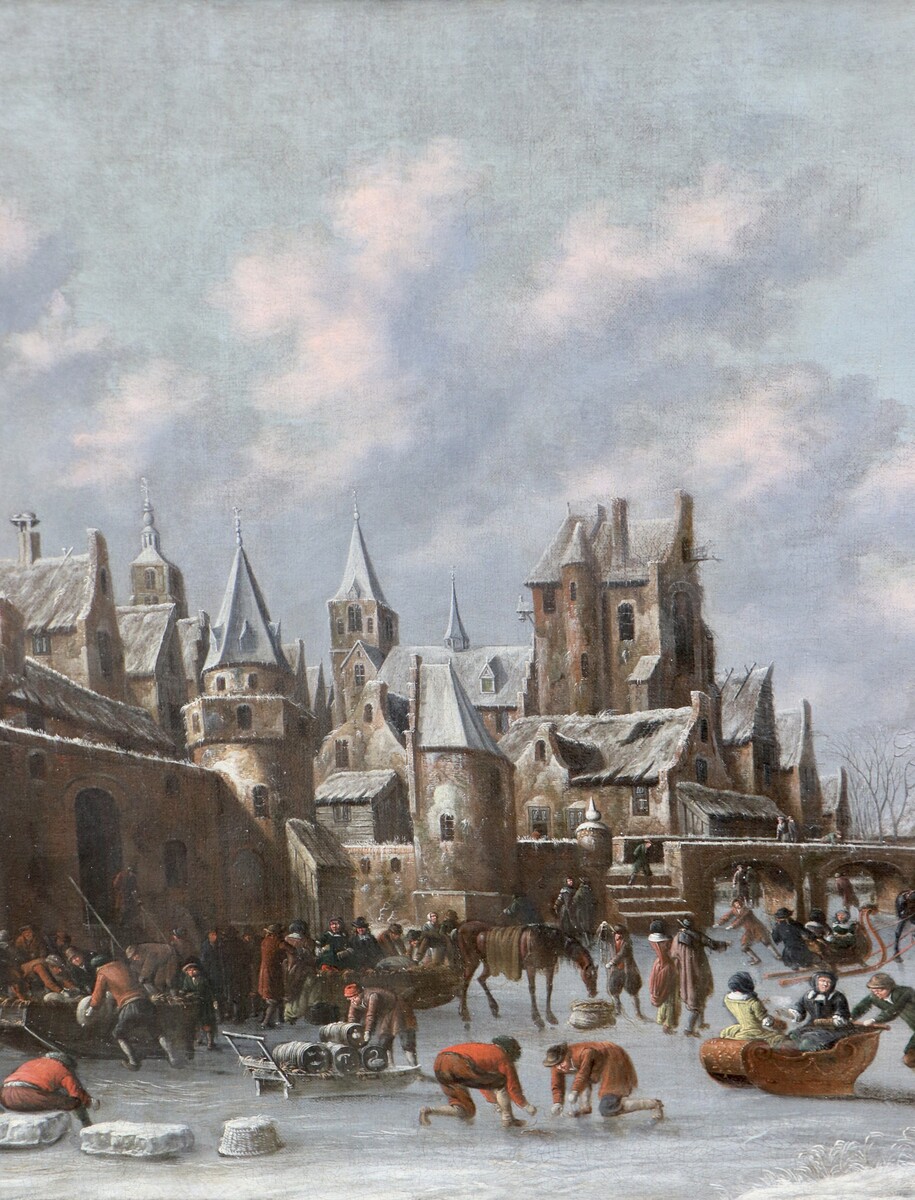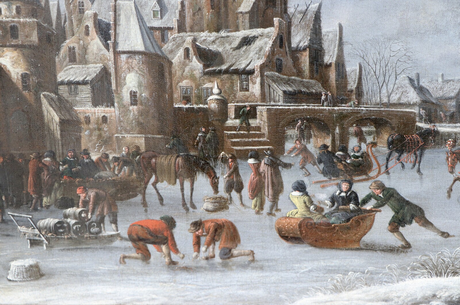 Our sweeping winter vista ranks amongst Heeremans’ best and most detailed winter landscapes. From circa 1550 until circa 1850 Europe suffered under a small ice age. Two thirds of the winters in the Low Countries between 1600 and 1700 were very cold with long periods of frost and snow. This explains the popularity of ice skating and sledding, and its representation in paintings and engravings during the 17th century.