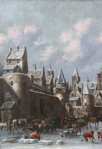 Heeremans painted fictitious views of ice skaters outside a small village or outside the ramparts of a small town, clearly inspired by his home town Haarlem. He also painted many summer scenes set in small, unidentifiable villages of Holland. Just one of these small places, Medemblik, has been identified in a painting, formerly in London with the Adam Jacobs Gallery.