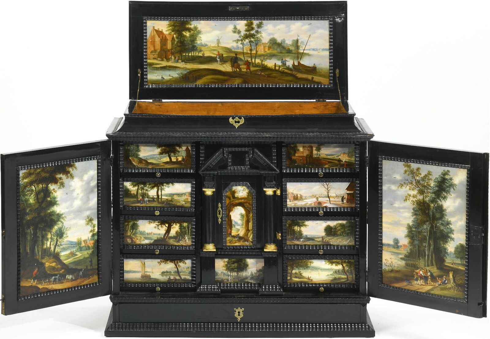 An Antwerp ebony veneered cabinet with village landscapes and scenes from daily life