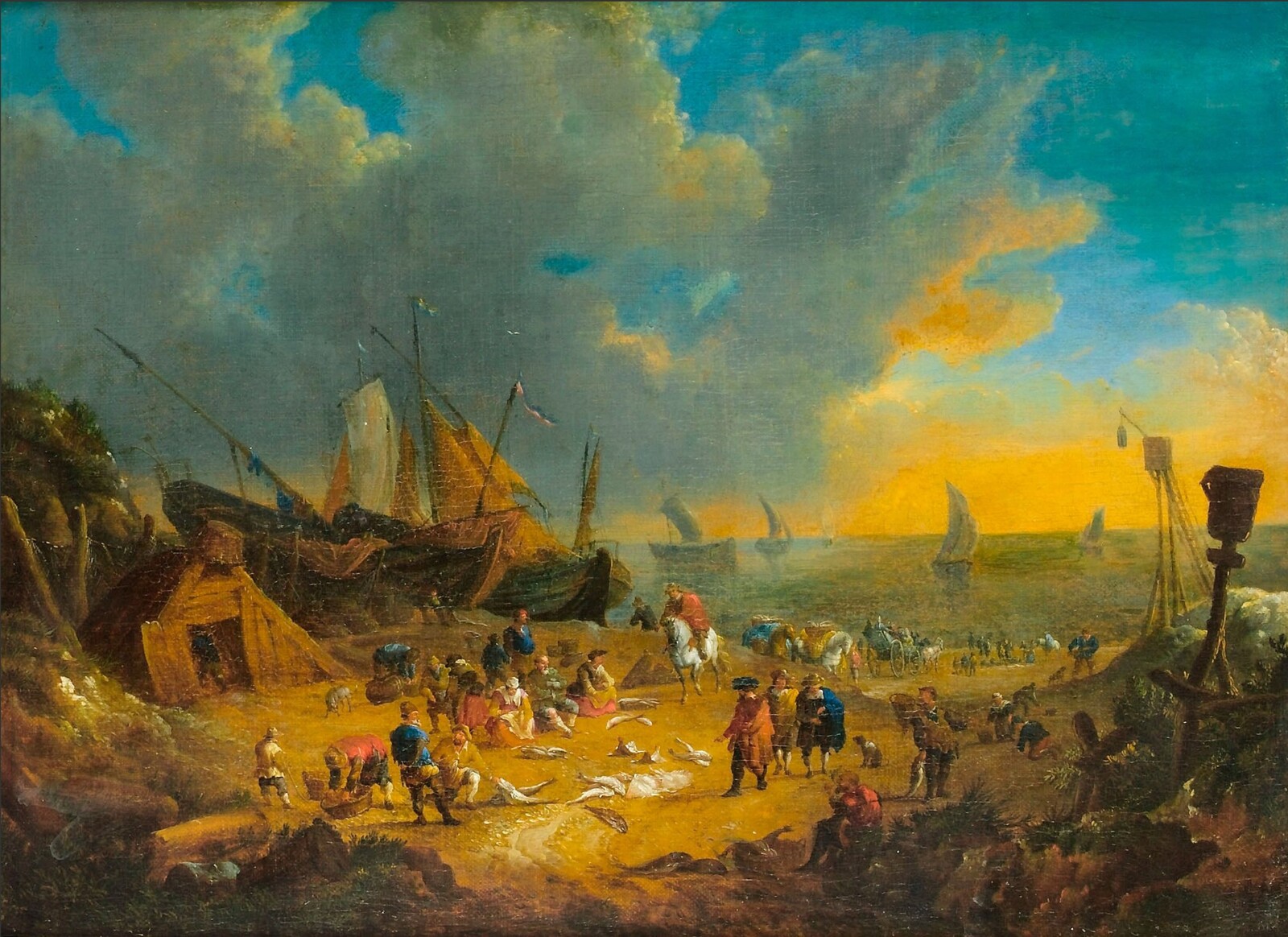 Elegant figures inspecting the catch on a beach with sailing barges