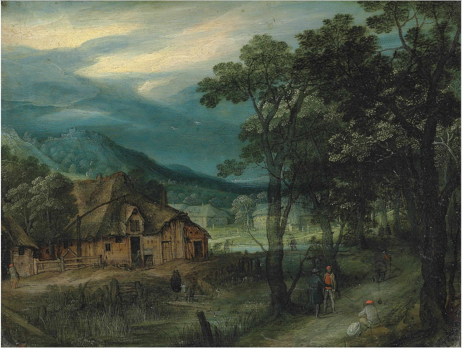A wooded landscape with travellers on a track by a village