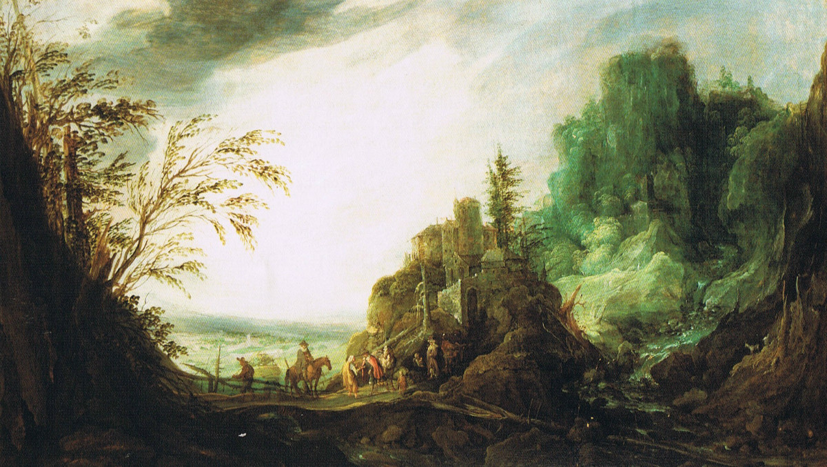 A rocky landscape with a waterfall and figures meeting on a bridge