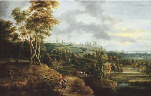 An extensive river landscape with a peasant couple