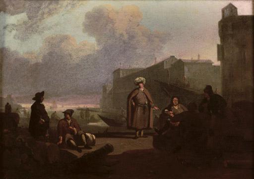 An Italianate harbour with merchants conversing on a quay