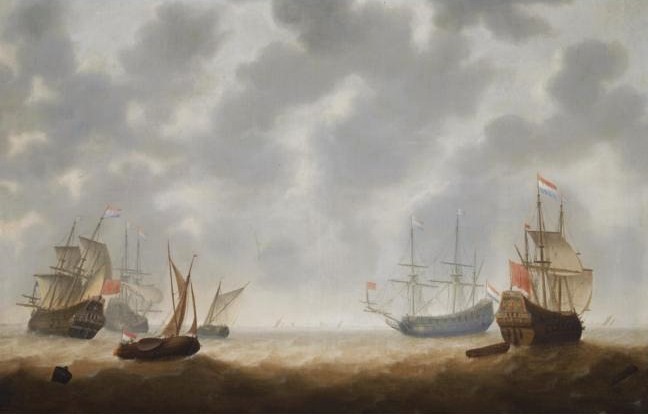 Four galley frigates and two smallships in choppy seas, shipping at the horizon