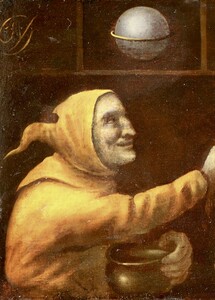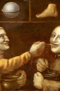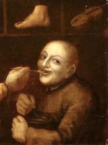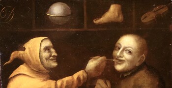 Flemish, Humanist, Renaissance culture knew many layers. In Antwerp around 1530, young Jan Massys painted a humorous rebus that clearly refers to the local Chambers of Rhetoricians, where amateur poets and theatre companies often competed with puns. This hilarious painting alluded to figures with primitive, ‘unchristian’ impulses in the underbelly of society: a ridiculous jester and an ill-mannered peasant. Figures that the city dwellers looked down on. The pictorial rebus at the top expresses a sixteenth-century Flemish proverb: ‘De wereld voedt vele zotten’ = ‘The world feeds many fools.’