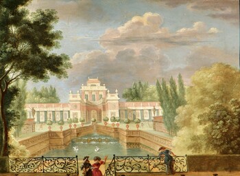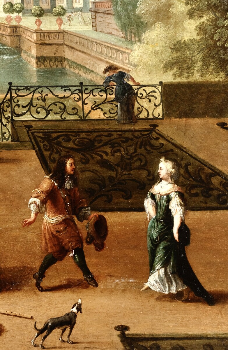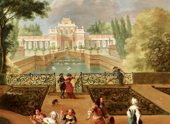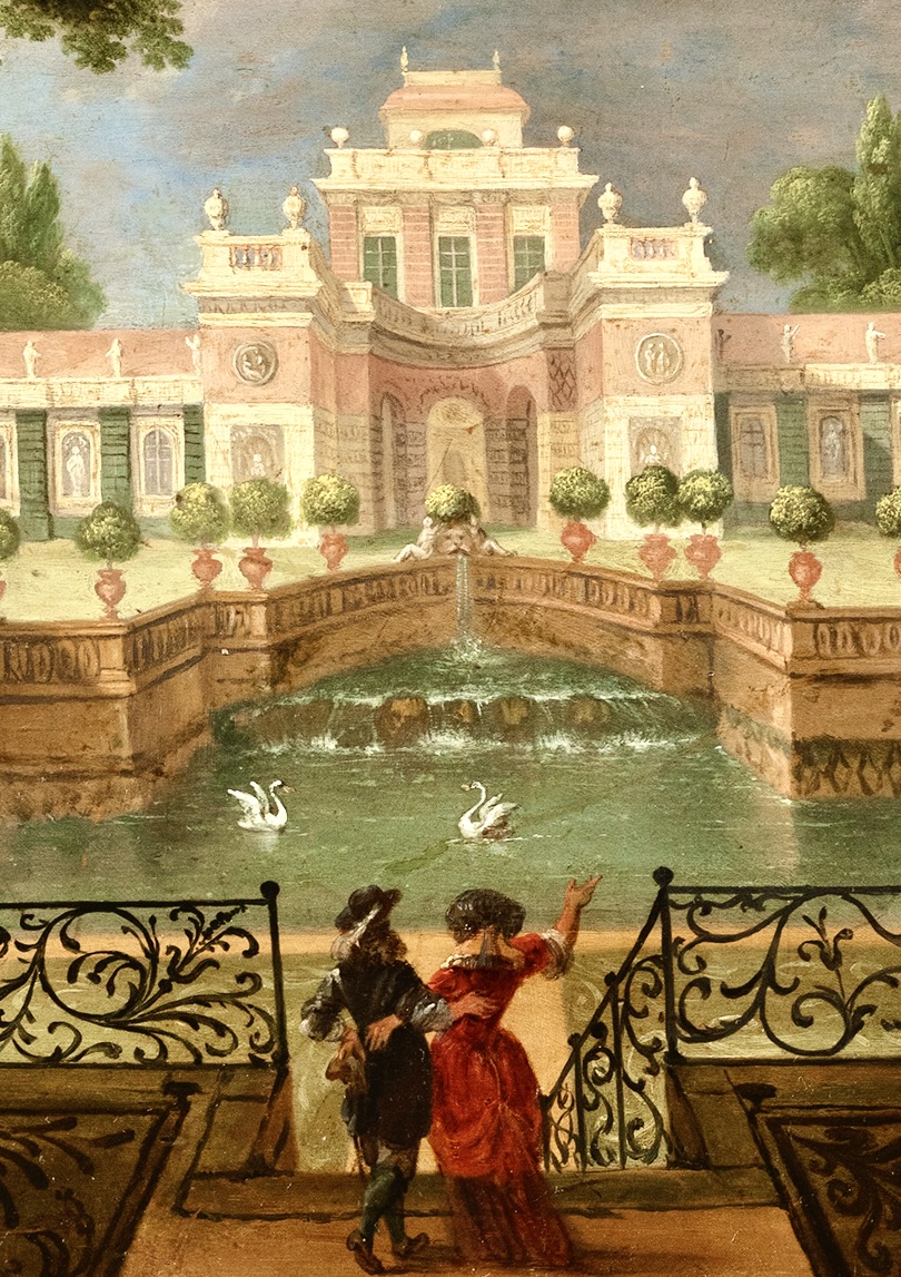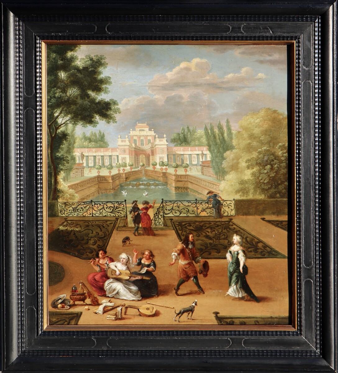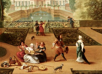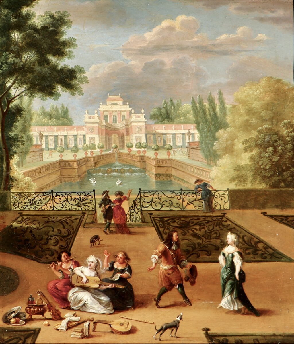 Elegant couples and three ladies playing music in a palace garden