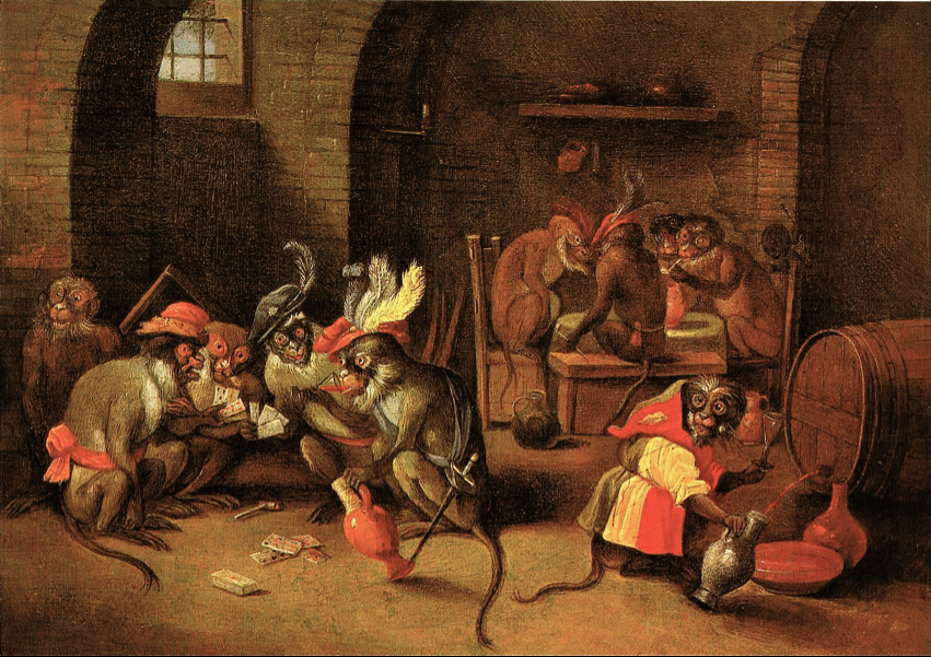 A singerie: monkeys in a guard room playing cards, drinking and smoking