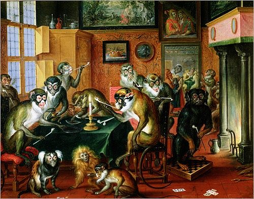 "Monkey-trick with a cat at the monkey-barber"
