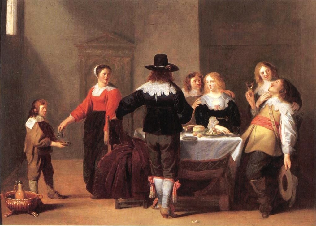 A guardroom interior with soldiers eating and drinking in female company
