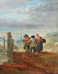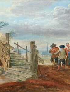 Inspired by Jan Brueghel the Elder (Brussels 1568 – 1625 Antwerp) younger generations of Flemish painters respectfully painted very attractive landscapes with peasant scenes in fresh colours. Typical of all of them is a bucolic sense of happiness, of “joie de vivre”, with small figures in anecdotally detailed poses set against a backdrop of a pleasing landscape or of some buildings.