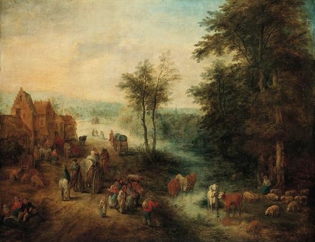 A village scene with waggoners on a road and boors watering their cattle in a river