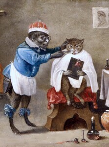 Singerie with a cat at the monkey-barber