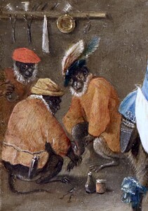 Typical of the Flemish monkey scenes is their sense for satirical humour, often with a moralizing tendency, criticizing the monkeys’ and therefore man’s (stupid) behaviour and his sense for social hierarchy.