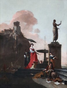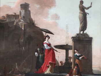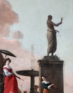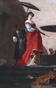 As you may see in our comparative paintings, Italianate harbour views with an elegant lady standing in the shade of an umbrella were a popular theme of Thomas Wijck.