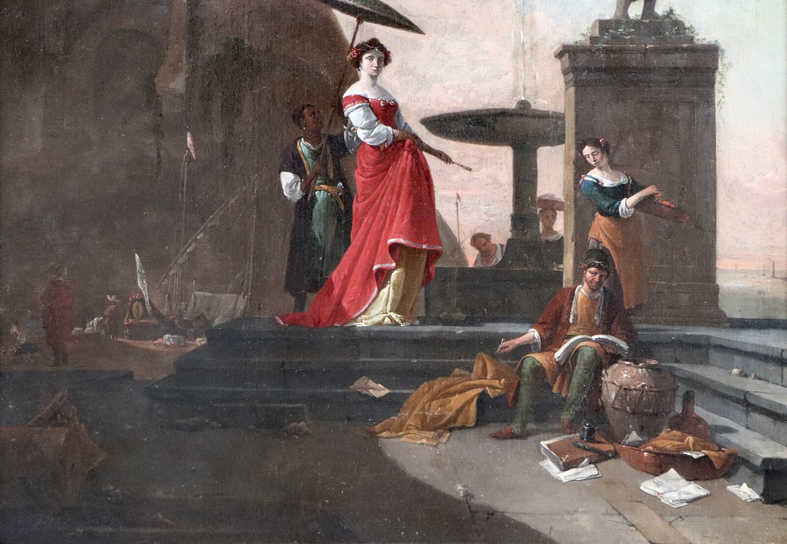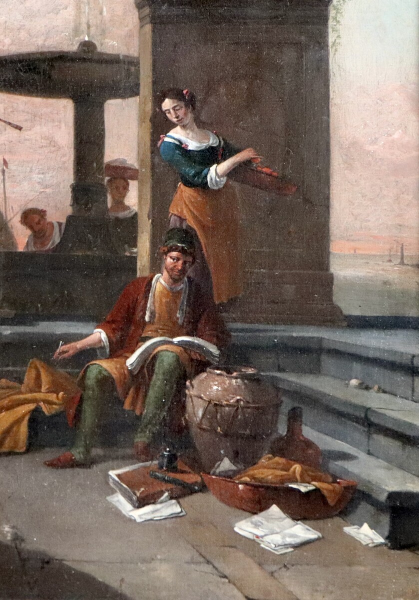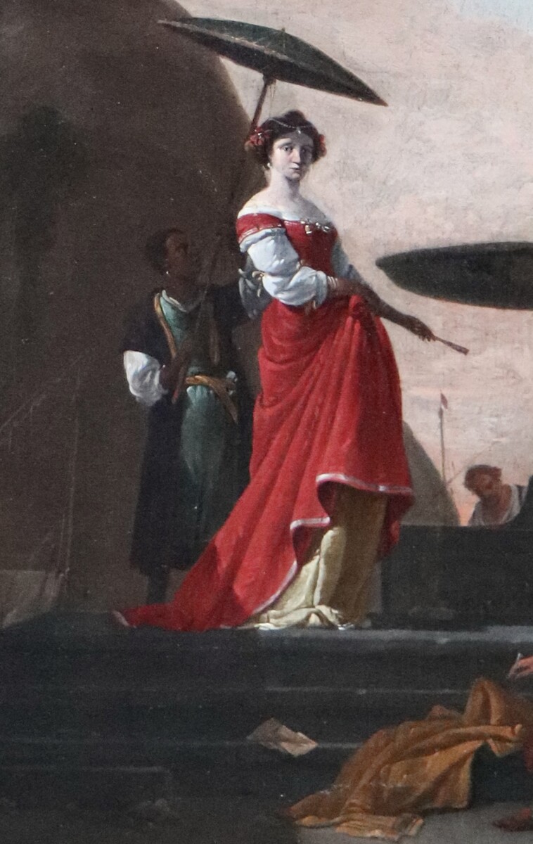 The three main figures in our painting, the sophisticated lady, the Blackamoor carrying her umbrella and the Jewish figure wearing a tall hat trimmed with fur, who is writing down the goods here himself, appear also in that completely different composition from the Musée Fabre. Even a similar tall jar (here in front of the seated Jew) appears in that composition. Finally the Turkish figure that is identified in the Montpellier painting as a pirate, overlooks here in the left background the loading or unloading of goods.