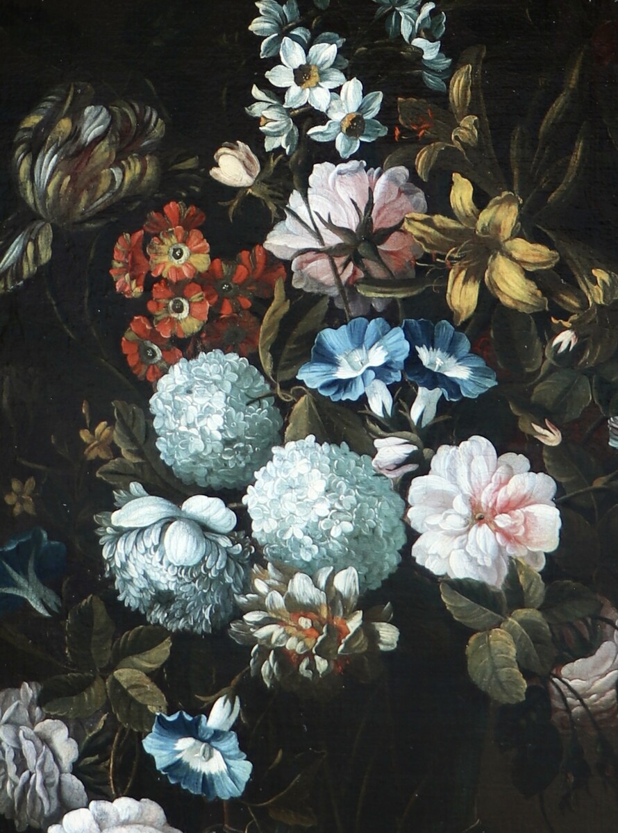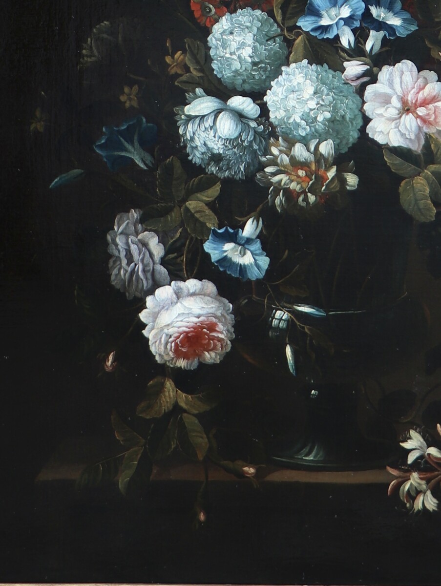 Our Simon followed in his footsteps, but rapidly moved in 1702 to London, where he would spend the rest of his life. Here he fell under the influence of the legacy of Jean-Baptiste Monnoyer I (1636 – 1699): this Franco-Flemish still life painter from Lille had arrived in London for the first time in 1690 and died also there 9 years later. Monnoyer too had been trained in the Flemish still life tradition, had become one of the important still life painters under King Louis XIV and had exported that royal and aristocratic French culture and taste to London.
