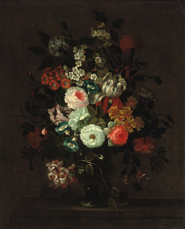 Roses, tulips, morning glory and other flowers in a glass vase on a ledge