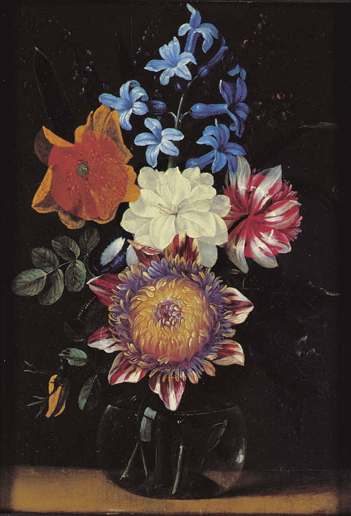 A chrysanthemum, a hyacinth, a poppy and other flowers in a glass vase