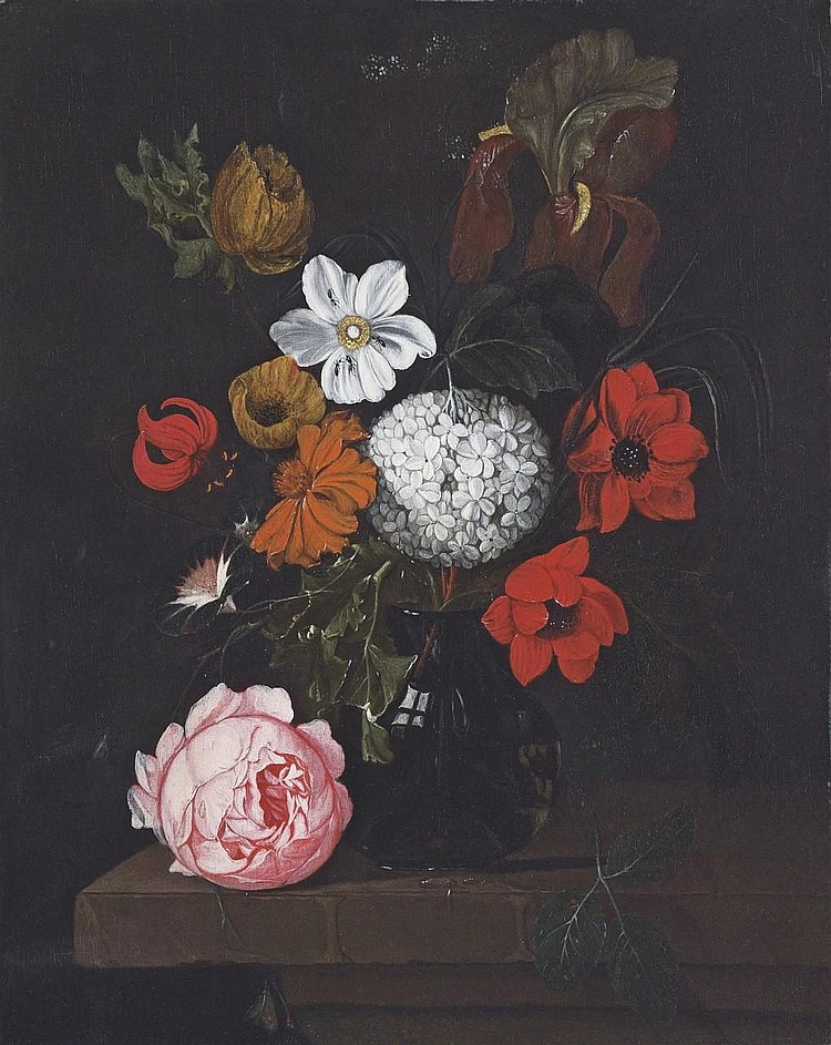 Corn poppies, a peony, a chrysanthemum and other flowers in glass vase