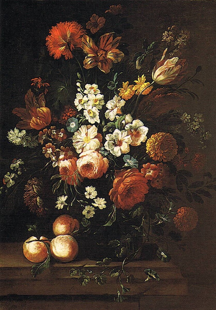 A still life with flowers in a glass vase with a hoopoe, plums and a bunch of grapes