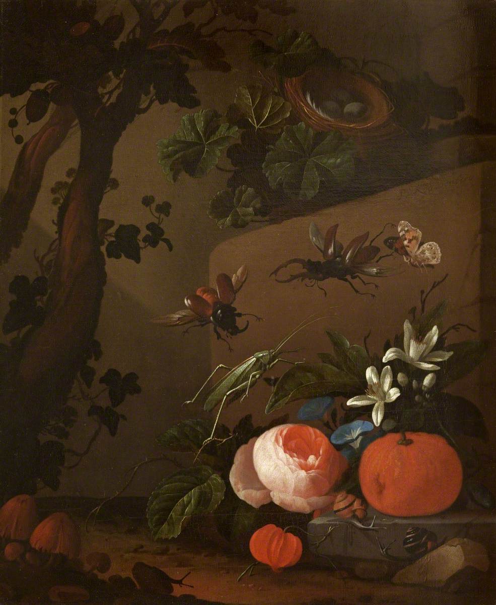 One of a pair : a still life with a bird’s nest, flowers, fruit and insects
