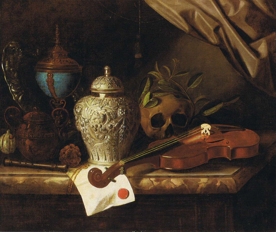 A Vanitas still life with a violin, a recorder, a skull and a silver ginger jar