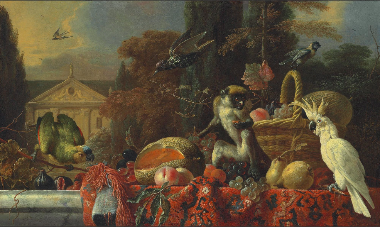 "A Moluccan cockatoo, two parrots and a fruit still life"