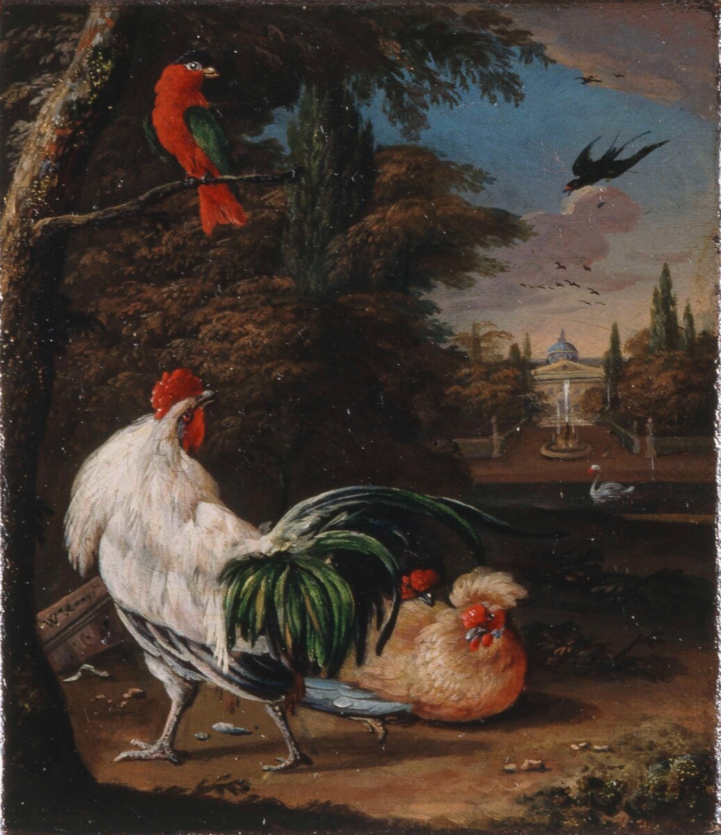 "A Moluccan cockatoo, two parrots and a fruit still life"