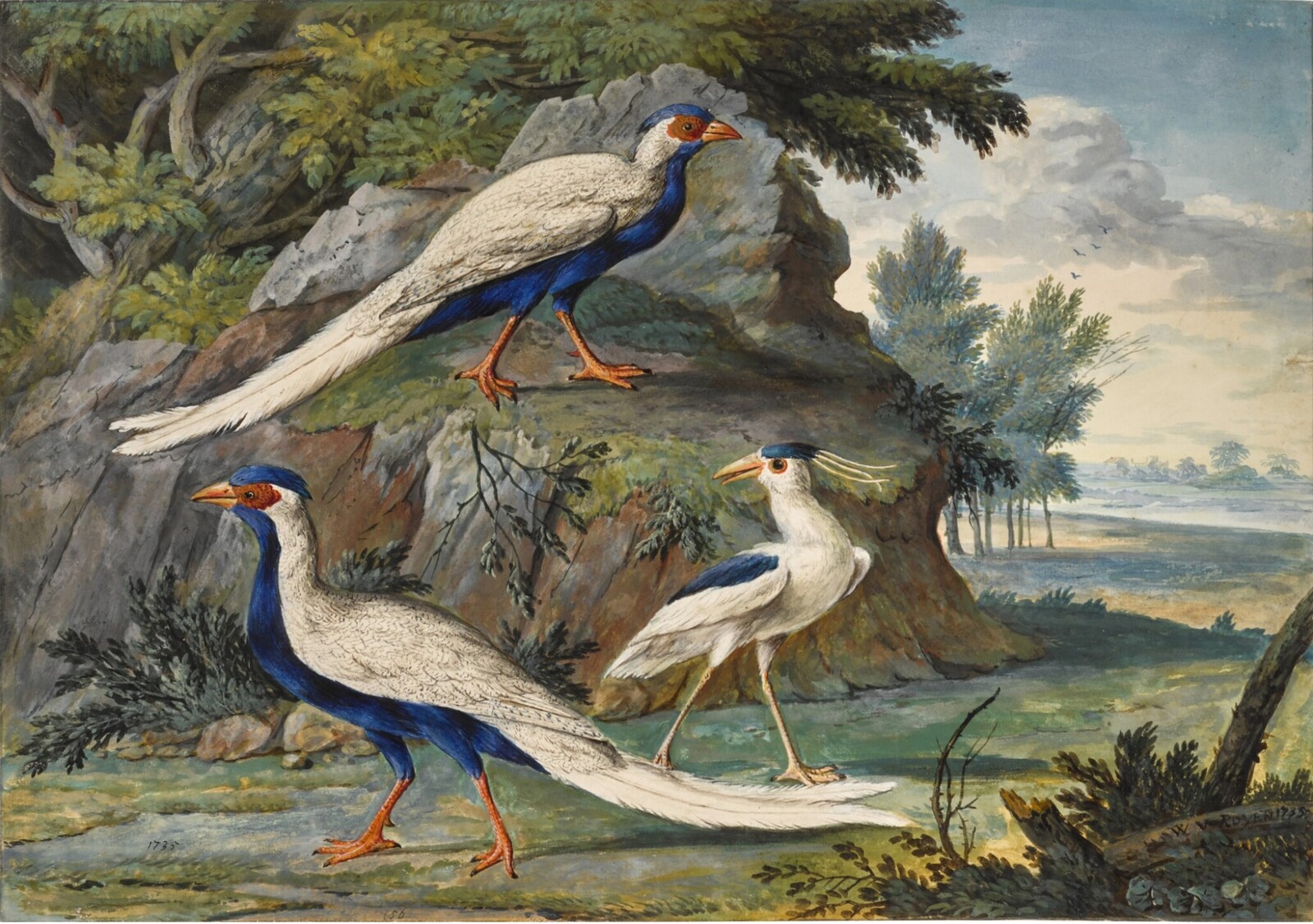 "A Moluccan cockatoo, two parrots and a fruit still life"