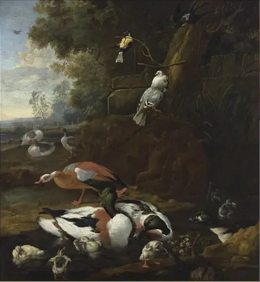 Wild ducks, geese, two doves, a swallow and a great tit in a landscape
