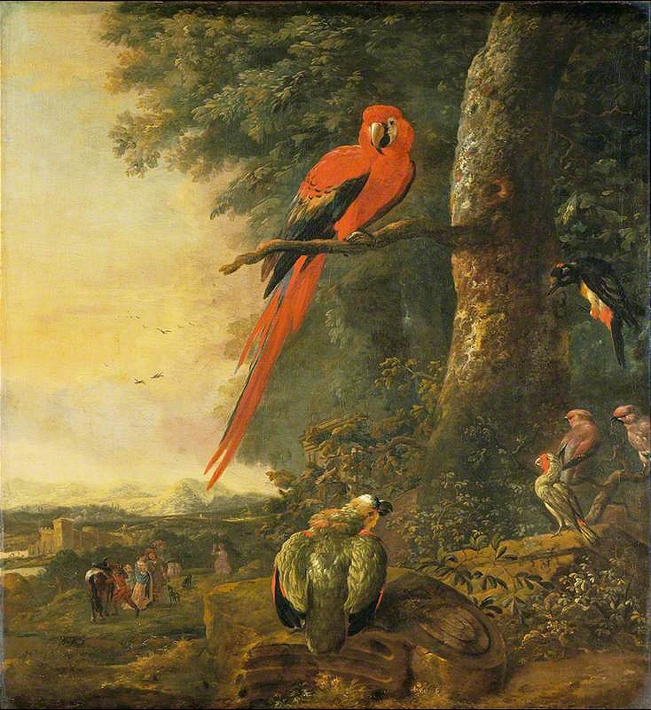 "A Moluccan cockatoo, two parrots and a fruit still life"