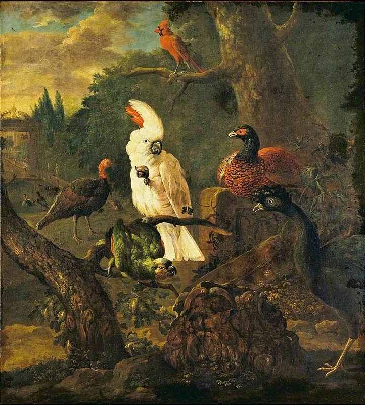 "A Moluccan cockatoo, two parrots and a fruit still life"